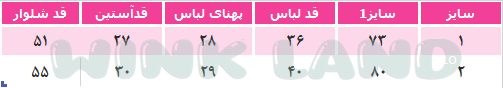 جدول سایز بندی آن بصورت زیر میباشد: