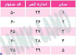 علاوه بر این به سایز بندی توجه فرمایید و با توجه به جدول زیر ثبت سفارش فرمایید و همیشه یک الی دو سانت خطای اندازه گیری لحاظ فرمایید.